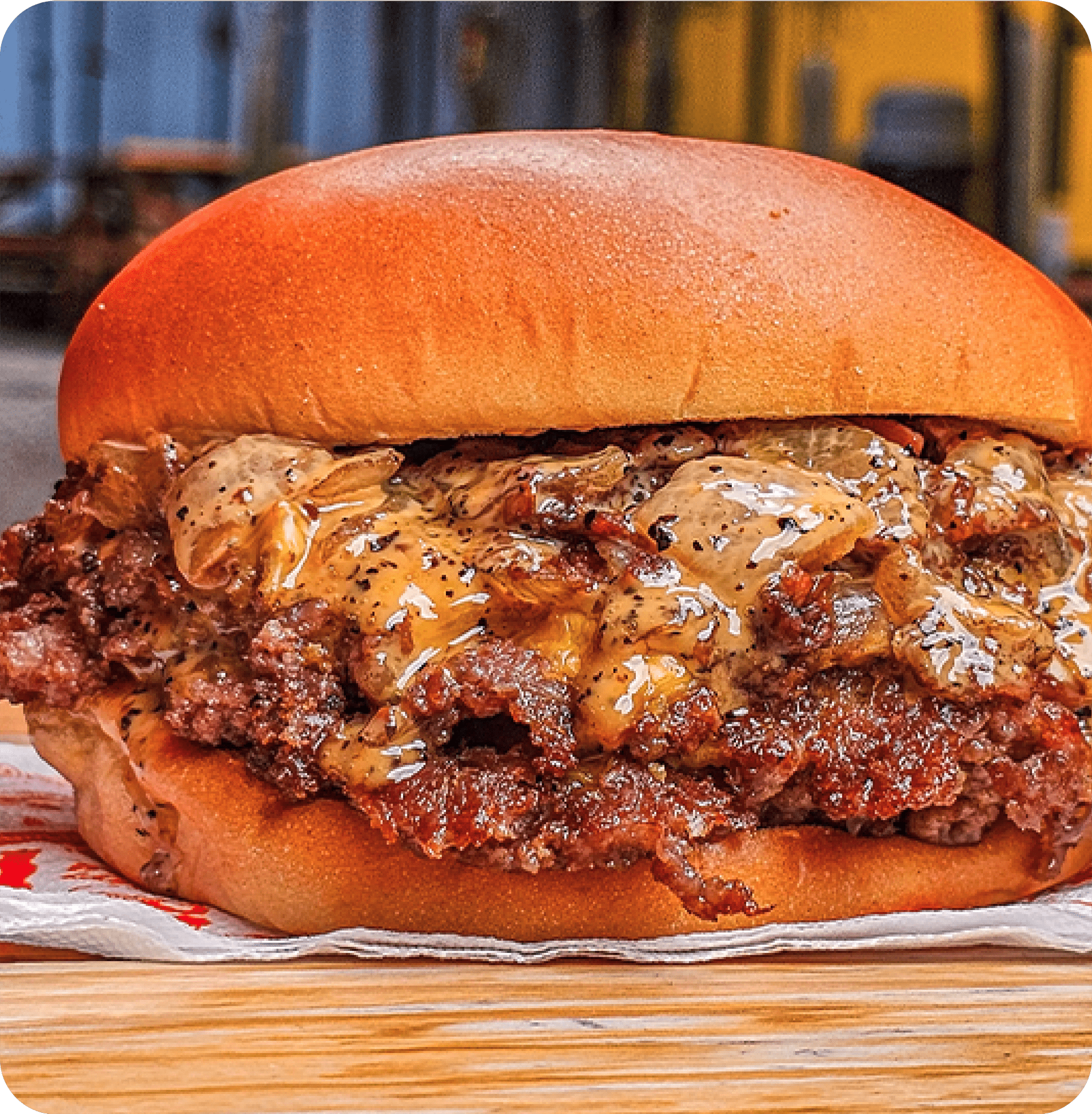 Hamburguesa hecha con Carne Smash 140g dos rebanadas de queso americano y aderezo de ajo Incluye 120g de original fries Pidela ONION SMASH Carne cocida con laminas delgadas de cebolla